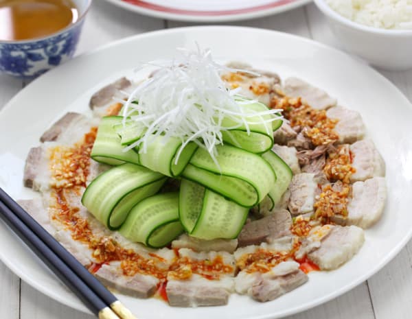1. Boil pork belly until cooked. Cut cucumbers into sections or slice with a slicer. Arrange on a serving plate. Sprinkle half the Chinese parsley on cucumbers. Slice pork belly and arrange on cucumbers.