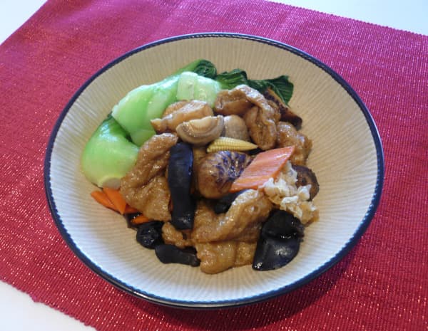 Add in cloud fungus, baby corns, white fungus, carrots and fried wheat gluten pieces. Mix in Lee Kum Kee Vegetarian Stir-Fry Sauce and water. Bring to a boil.