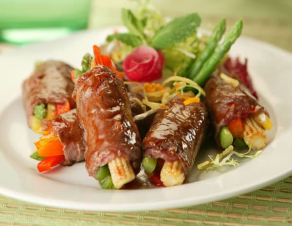 1. Mix beef slices with marinade ingredients. Divide carrots, celery and capsicums into 12 portions. Put 1 portion of filling onto one beef slice and roll up. Repeat with remaining filling portions and beef slices.
