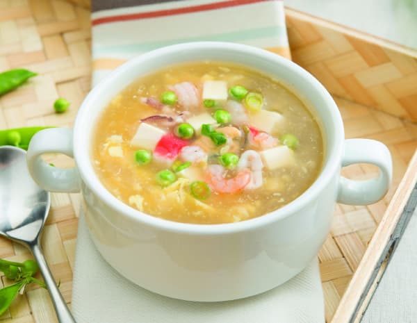Add starch-water mixture to soup and stir till thickened. Turn heat to low and slowly stir in beaten egg into soup and mix well. Serve.