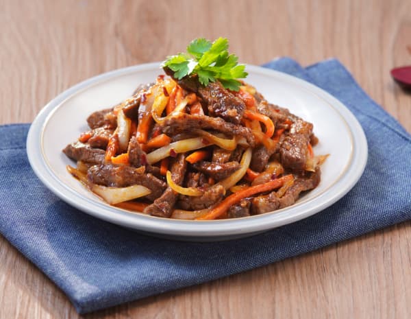 In another bowl, marinate beef fillet with Lee Kum Kee Panda Brand Oyster Sauce. In a pan, heat up Lee Kum Kee Chiu Chow Chilli Oil and put in beef. Stir-fry until cooked. Toss in carrots and onions and continue to stir-fry for 2 mins.